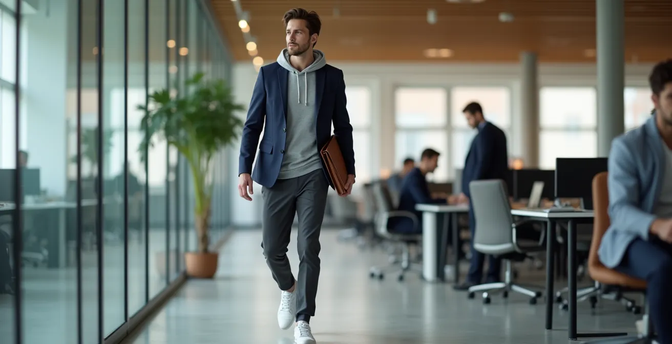 Les conseils génériques abondent : « optez pour des sneakers blanches épurées », « mariez un blazer avec un jean brut ». Ces règles, bien qu’utiles, ne touchent que la surface du problème. Elles traitent le streetwear comme une concession tolérée, un simple ajout décontracté à une tenue formelle. Cette approche est limitante et conduit souvent à des silhouettes manquant de conviction, où l’on ne se sent ni totalement professionnel, ni vraiment soi-même. Le risque est de passer pour un « ado attardé » qui refuse les codes de l’entreprise.