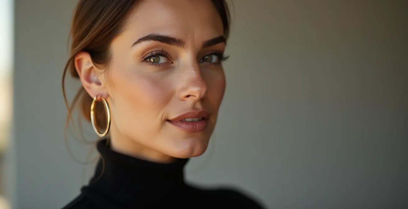 Le secret est de créer un écrin de minimalisme autour de ce bijou statement. Associez vos créoles géantes à une tenue aux lignes pures : un col roulé noir, une chemise blanche impeccable, un cachemire uni. Côté coiffure, dégagez le port de tête avec un chignon bas élégant ou une queue-de-cheval lisse. Le maquillage doit être sobre, un « nude » travaillé qui unifie le teint sans attirer l’attention. L’objectif est de créer un contraste puissant entre l’audace du bijou et la sobriété de l’ensemble.