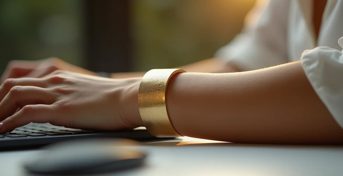 Le choix du poignet pour porter une manchette large au bureau va bien au-delà du simple confort. Il ne s’agit pas de sacrifier le style à la productivité, mais d’adopter une approche d’ergonomie stylistique. La véritable solution réside dans l’ajustement du bijou à sa morphologie, le choix stratégique des matières et un positionnement qui transforme cet accessoire en un puissant outil de communication non verbale, affirmant votre autorité sans jamais entraver vos mouvements.