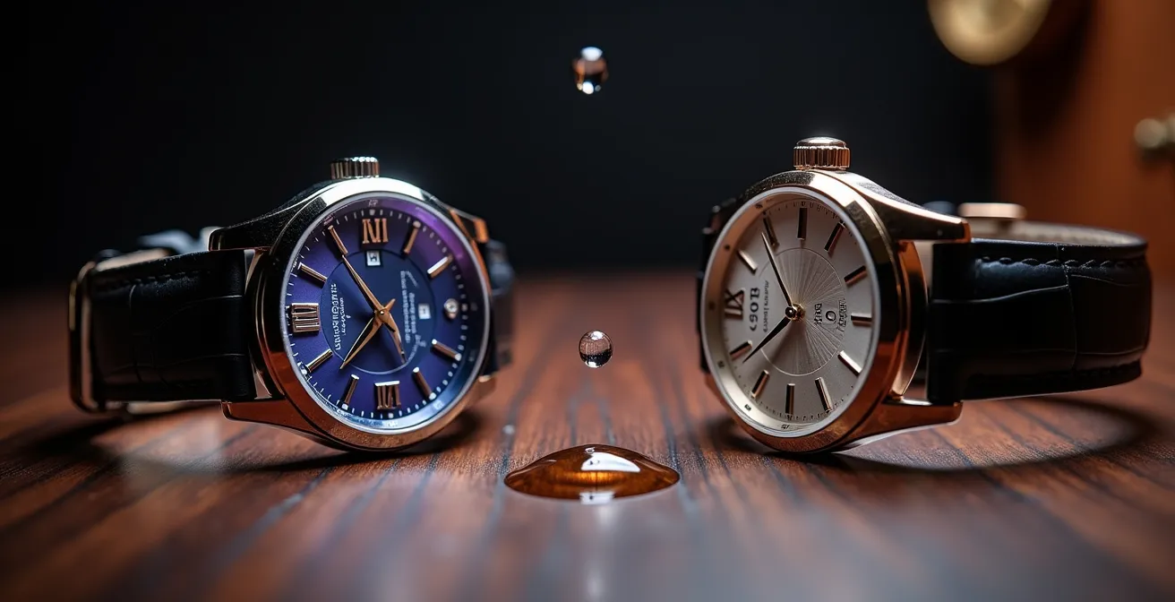 Le protocole est simple : après avoir soigneusement nettoyé le verre, déposez-y une goutte. Observez sa forme. Ensuite, inclinez la montre. Sur un saphir, la goutte glissera lentement, comme une bille de mercure, sans laisser de traînée humide. Sur un verre minéral, elle laissera une trace. Il est toutefois crucial de noter une limite majeure à ce test : la présence d’un traitement anti-reflet externe. Ce dernier possède ses propres propriétés de surface qui peuvent fausser le test en interagissant avec l’eau à la place du saphir. Pour un diagnostic infaillible, il faut donc d’abord déterminer la nature de ce traitement.